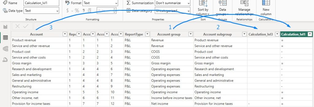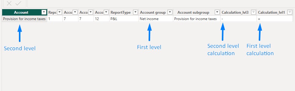 For example, as shown below, two additional columns (Calculation lvl1 and Calculation lvl3) define how calculations are applied at different levels using the above symbols.