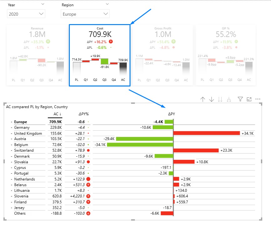 When selecting the KPI card “Cost”, the Zebra BI Tables below automatically inverts: