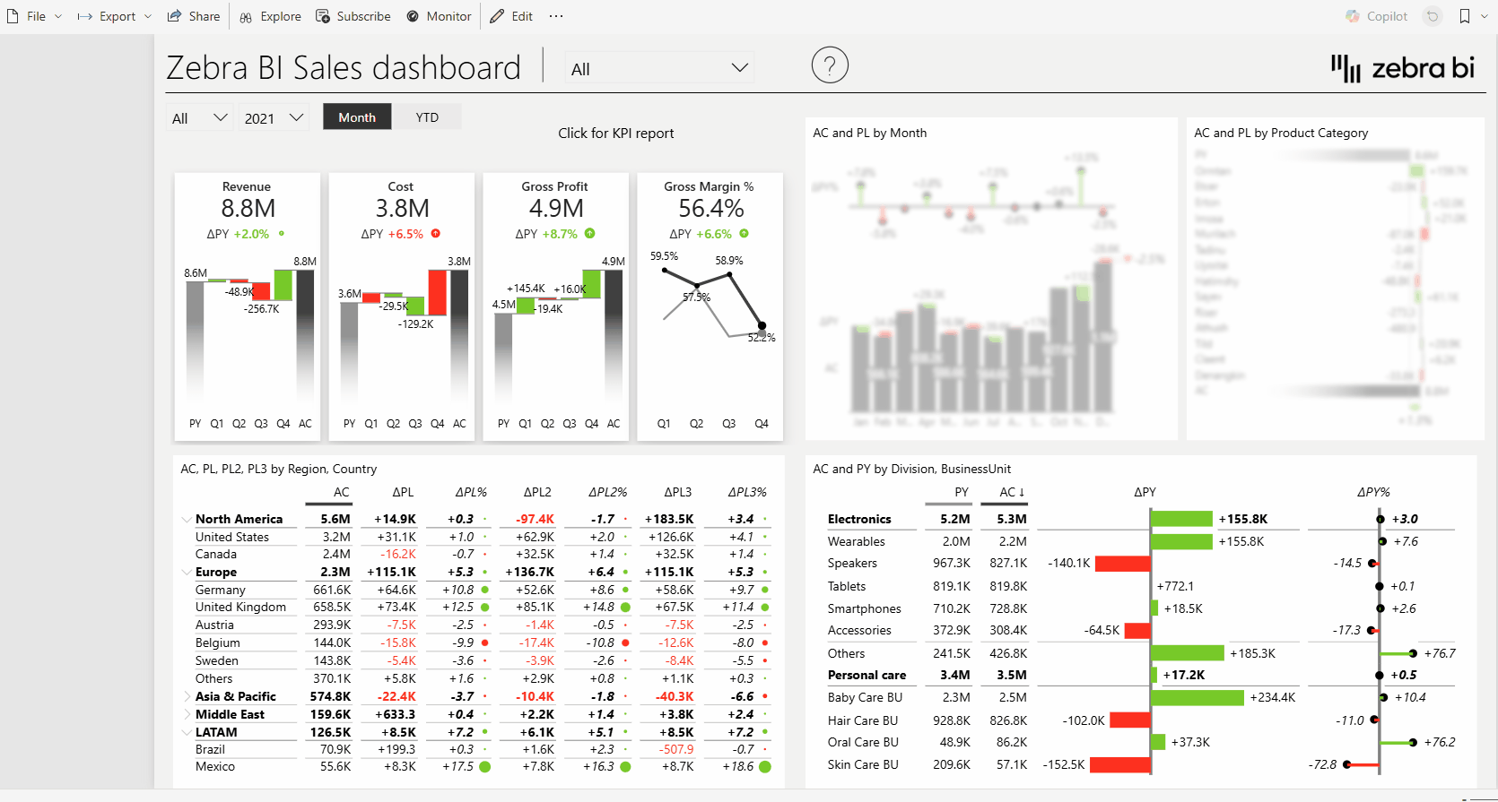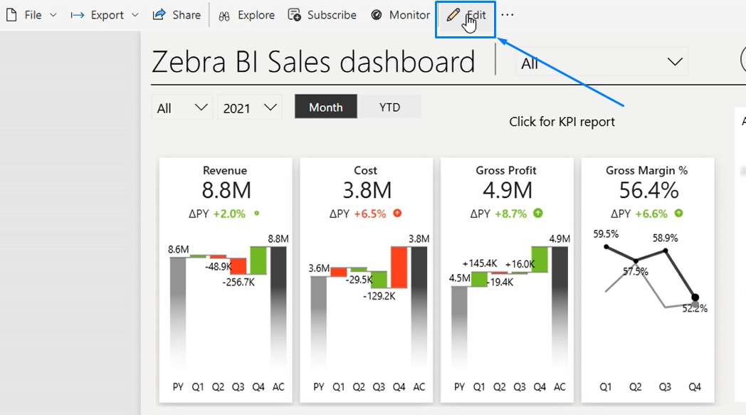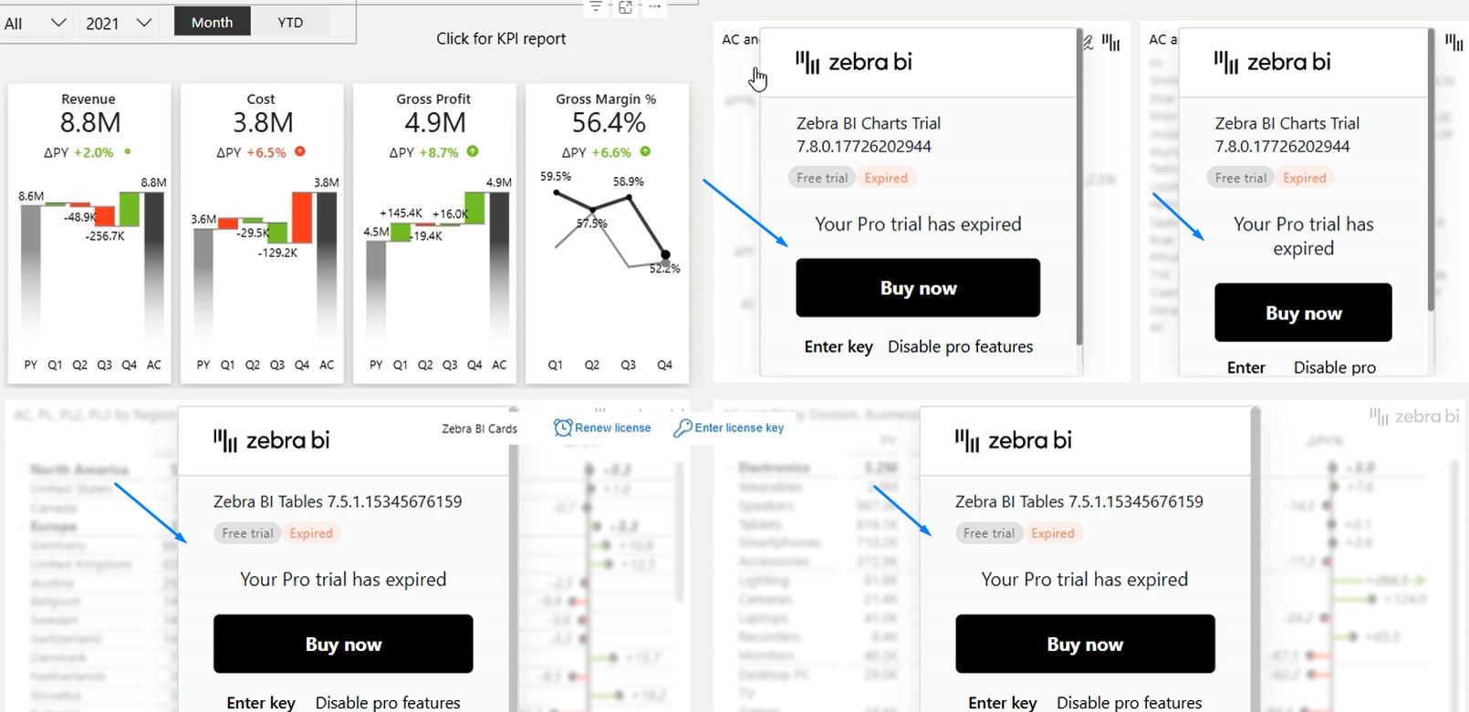Below, you will notice that as soon as a user “Edits” the report, the visuals get blocked, prompting a user to insert a new license key. License key needs to be inserted ONCE into each type of visual, so a maximum of three times per report (Zebra BI Tables, Charts, and Cards) and navigate to a different page so the license key gets recognized everywhere. Save the report and go back to Reading mode.