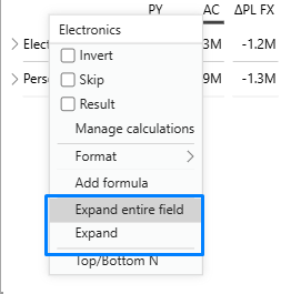 ❗Important: You won’t be able to use the native drill up/down arrows with DirectQuery and ragged hierarchies option. Instead, you can right-click on any row and select collapse/expand from the menu.